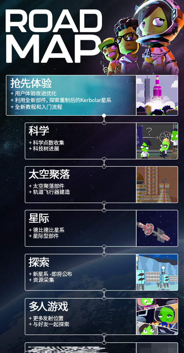 随着游戏的不断更新,玩家将获得整套全新一代的工具和技术,包括新引擎、部件、燃料等等。全新科技不仅会制造出有待玩家解决的新谜题,还能让玩家达成原作Kerbolar星系中已有的成就和尚未包含的新成就。